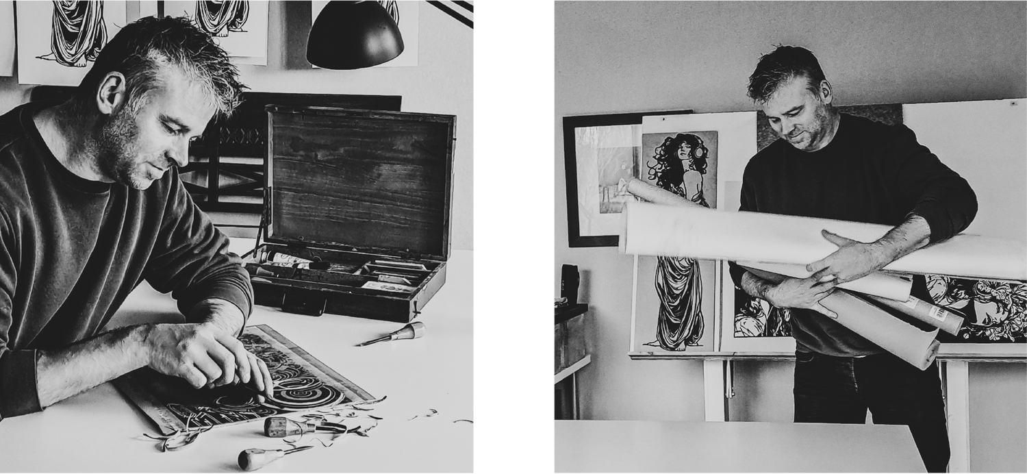 Ik ben Christiaan Dekker, een Nederlandse kunstenaar met een eigentijdse blik op traditionele hoogdruktechnieken. In mijn atelier combineer ik vakmanschap met een persoonlijke artistieke visie. Elk werk ontstaat vanuit een zorgvuldig ambachtelijk proces waarbij ik met de hand ontwerpen uit linoleum of hout snijd.